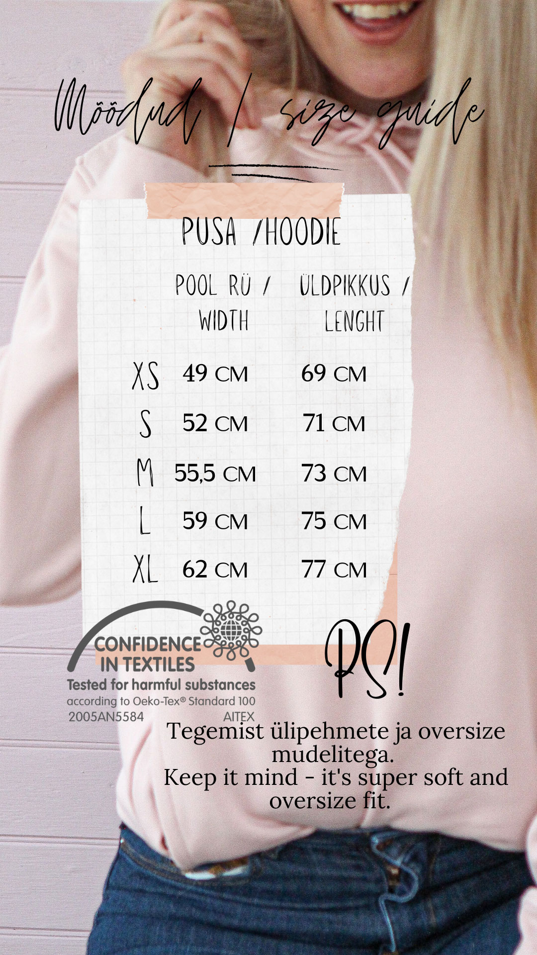 Hind sisaldab kahte dressipluusi (üks täiskasvanule ja üks lapsele). Pusadel on üks sõnum esiküljel, pisike sõnum kuklal ja üks peidetud sõnum seespool. Superpehme ja soe klassikalise ümara kaelusega dressipluus.